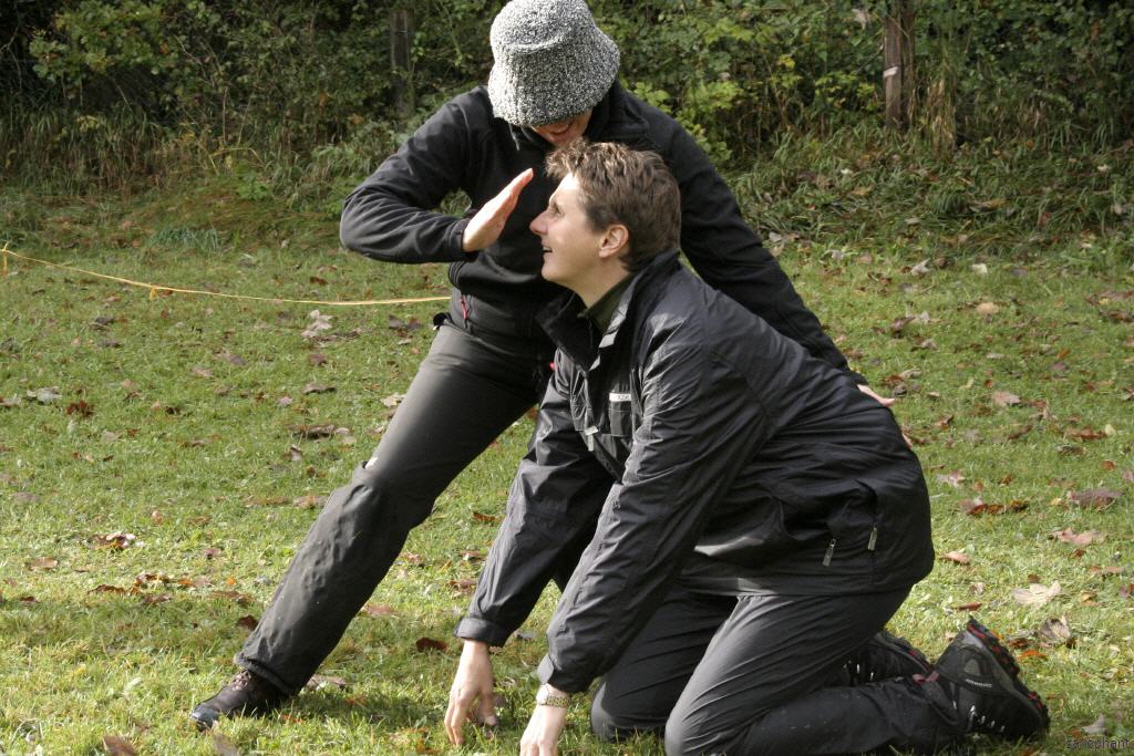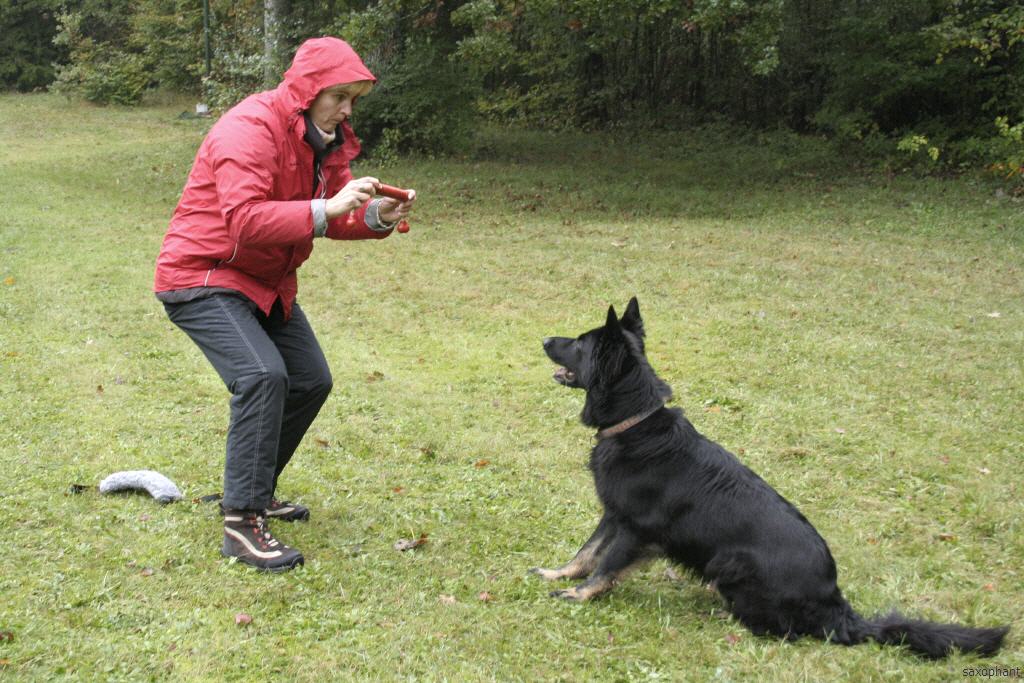 Einige Trockenübungen lassen uns zum einen belustigt auf Wally (die die Hunderolle bei den Demonstrationen einnimmt) und Antje blicken, um in der Folge selbst diese Rolle auf dem Hundeplatz einzunehmen. Wir setzen Haltung und Bewegung, Mimik und Gestik, Berührung, Akustik, Geruch, Futter und Beute, wild wechselnd ein, um die Aufmerksamkeit unserer tierischen Partner zu bekommen.